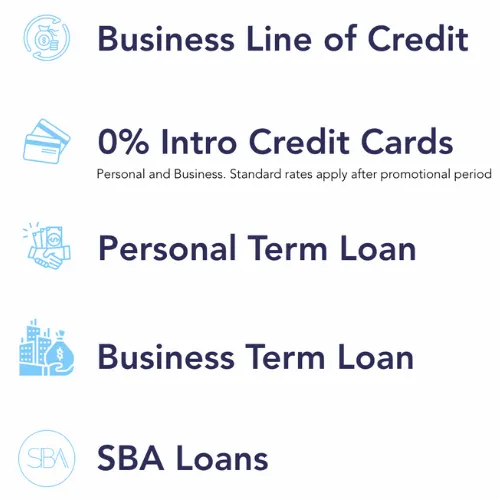 We have a complete funding marketplace with startup options ranging from 0% personal cards, 0% business credit cards, business lines of credit, no collateral 5-year loans, equipment loans, and SBA loans.